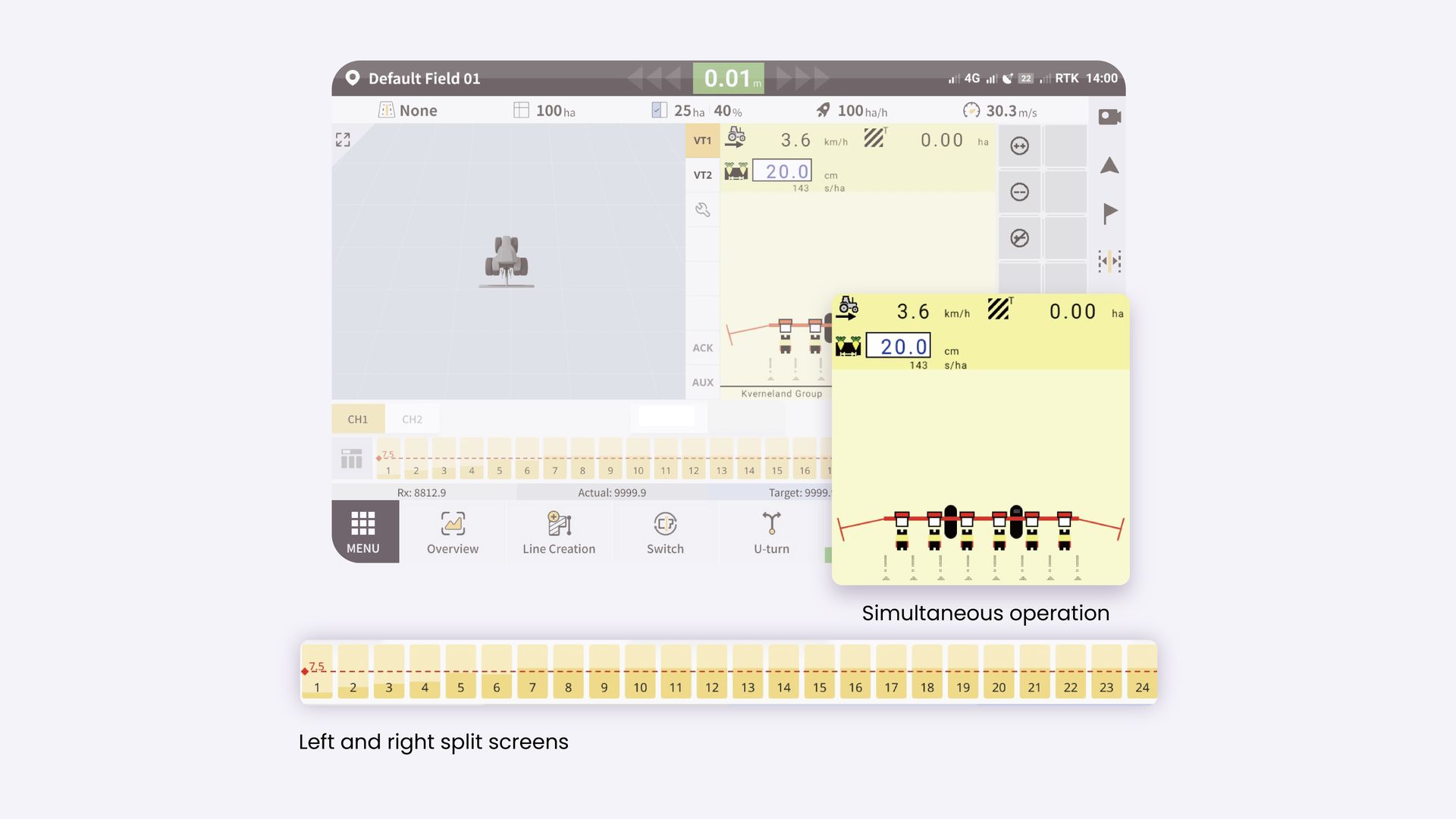 The AT2 Max stretches the screen size to 12.1 inches, a 46% increase in visible area compared to the standard AT2. With a larger screen, you can see everything more clearly on the display and reduce operation errors while driving your tractor at high speeds to carry out tasks. You can also work on multiple tasks at the same time through a split-screen view without constantly switching between windows.